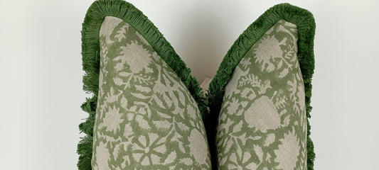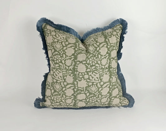 Green block print pillow with blue fringe trim, green floral pillow, green block print cushion