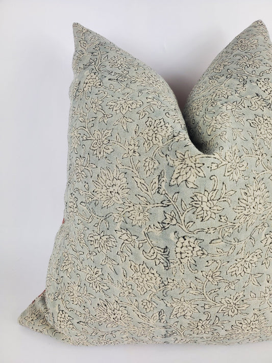Green block print pillow, block print green floral pillow, block print cushion, neutral throw pillow, designer pillow