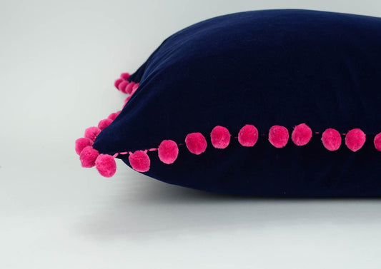 Pink pom pom pillow // navy and pink pom pom pillow // navy velvet cushion // pink pom poms cushion // fuschia pom poms cushion