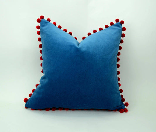 Blue velvet pillow with red pom poms // blue and red pillow // velvet pom pom pillow // pom pom pillow // pom pom cushion